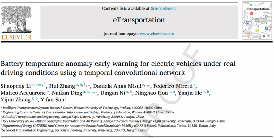 2025年7月3日,团队成员李少鹏作为第一作者,联合武汉理工大学智能交通系统研究中心张晖研究员团队、意大利都灵理工大学汽车研究与可持续交通中心Daniela Anna Misul教授团队,在国际交通电动化杂志eTransportation上发表题为《Battery Temperature Anomaly Early Warning for Electric Vehicles under Real Driving Conditions Using a Temporal Convolutional Network》的学术论文,在智能网联电动汽车运行安全监管领域取得新进展。