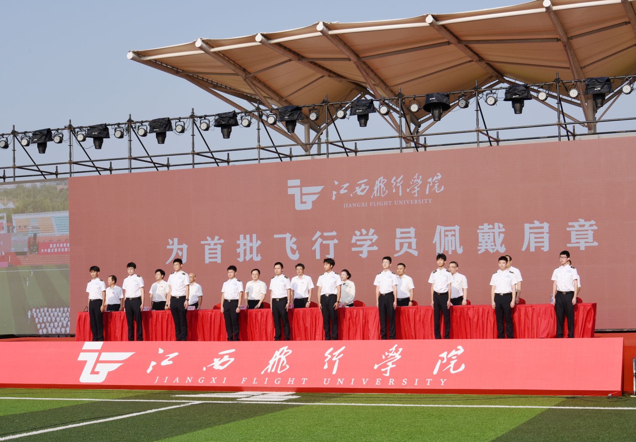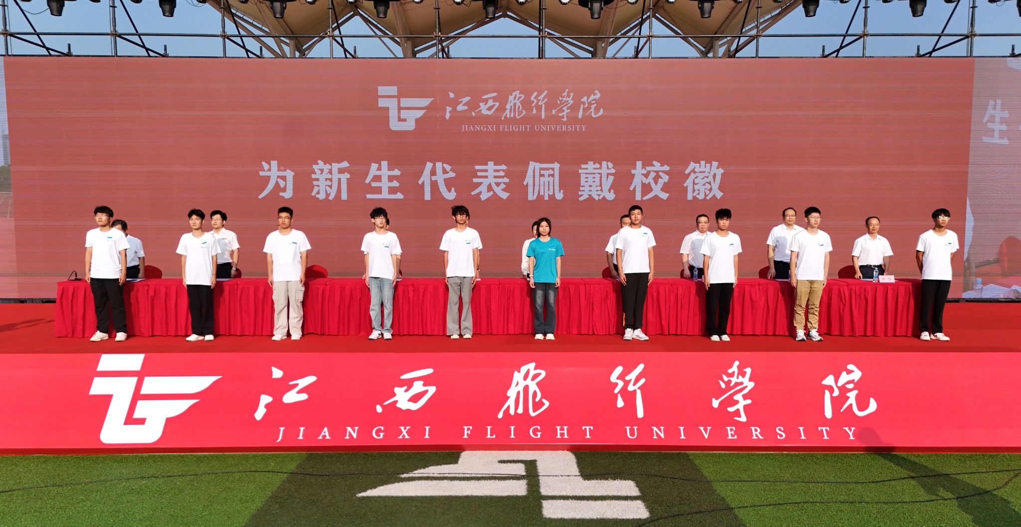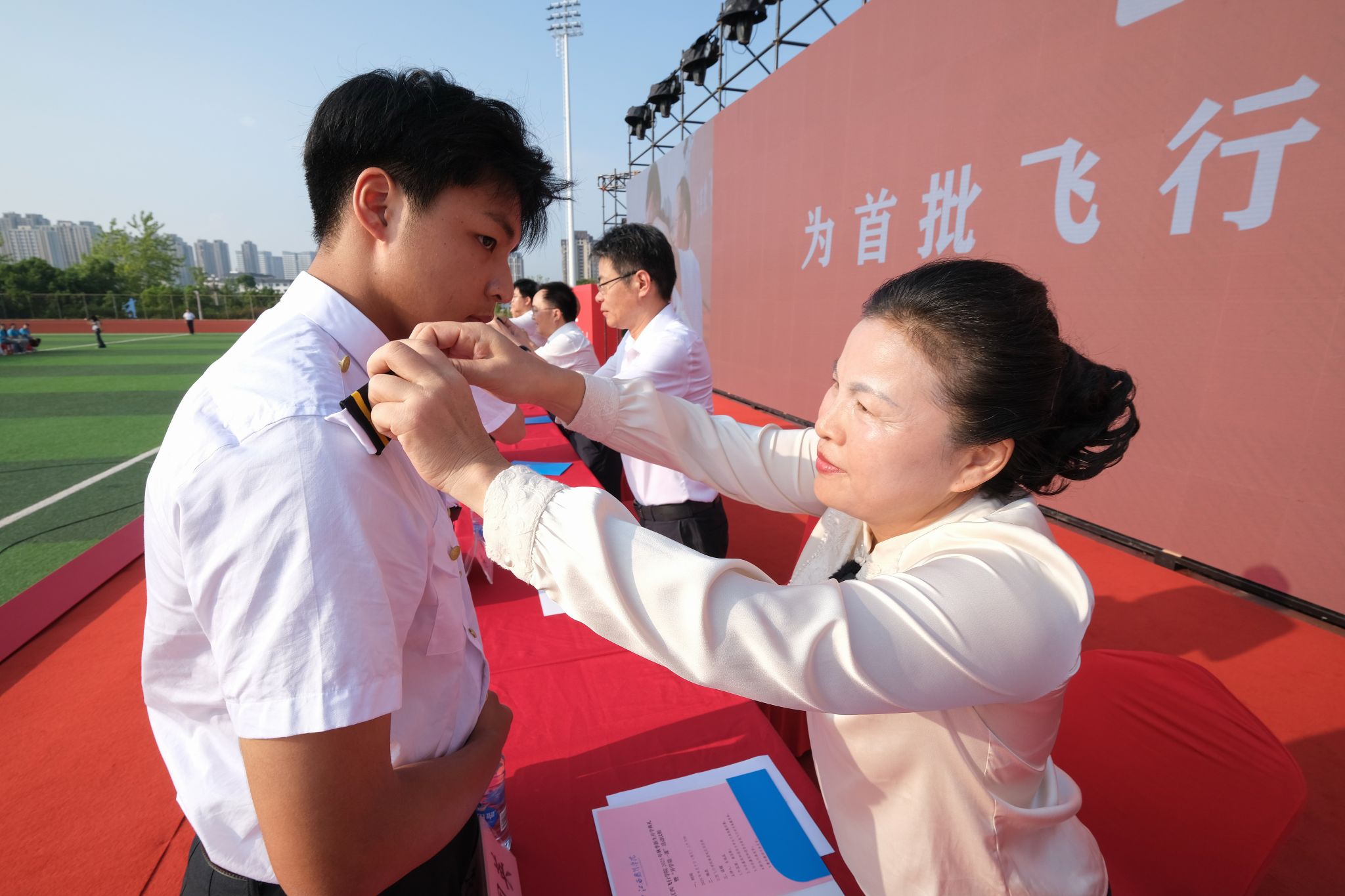 陈震、龙国英等在主席台就座的嘉宾为新生代表佩戴学校徽章,为首批飞行学员佩戴肩章。