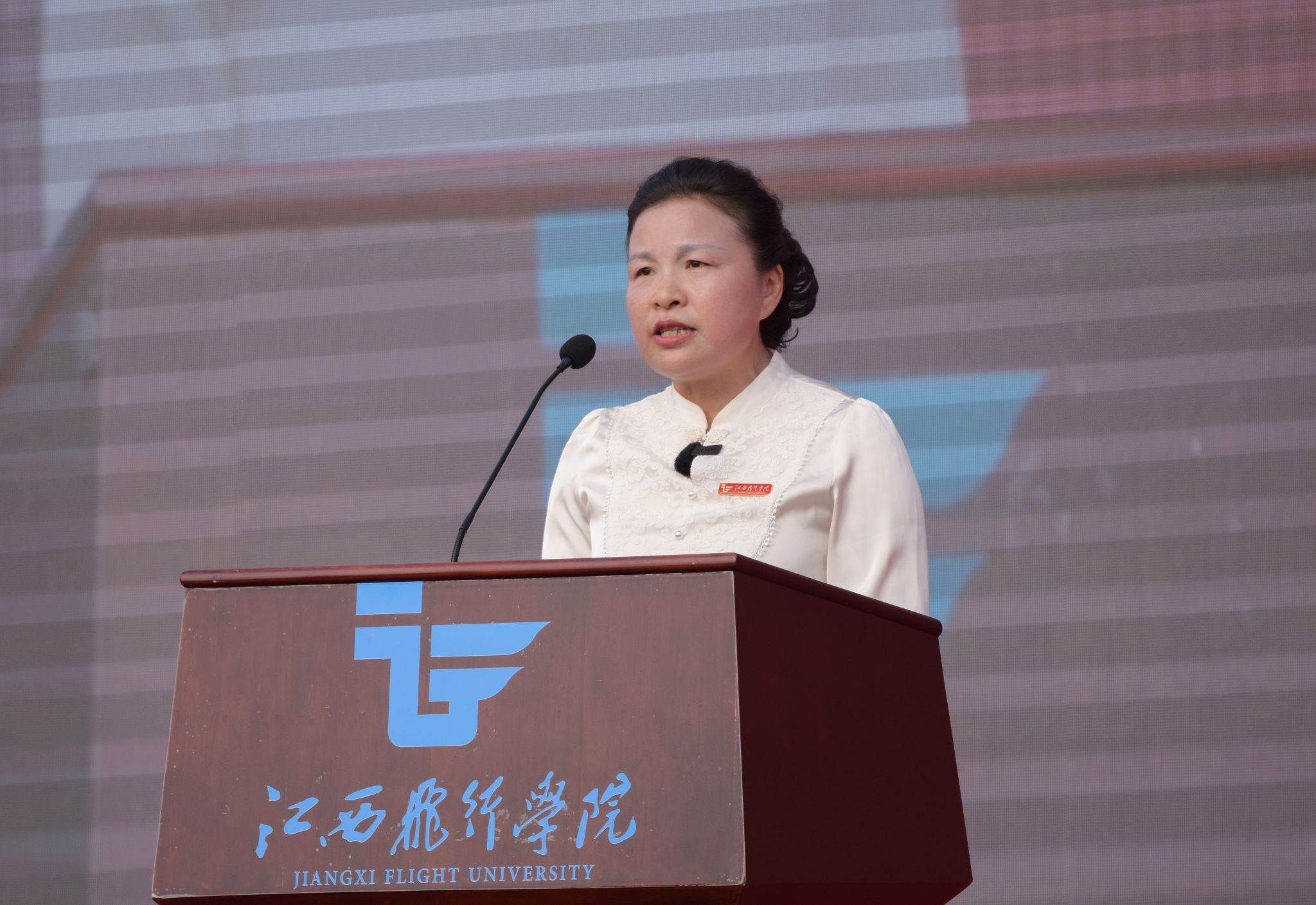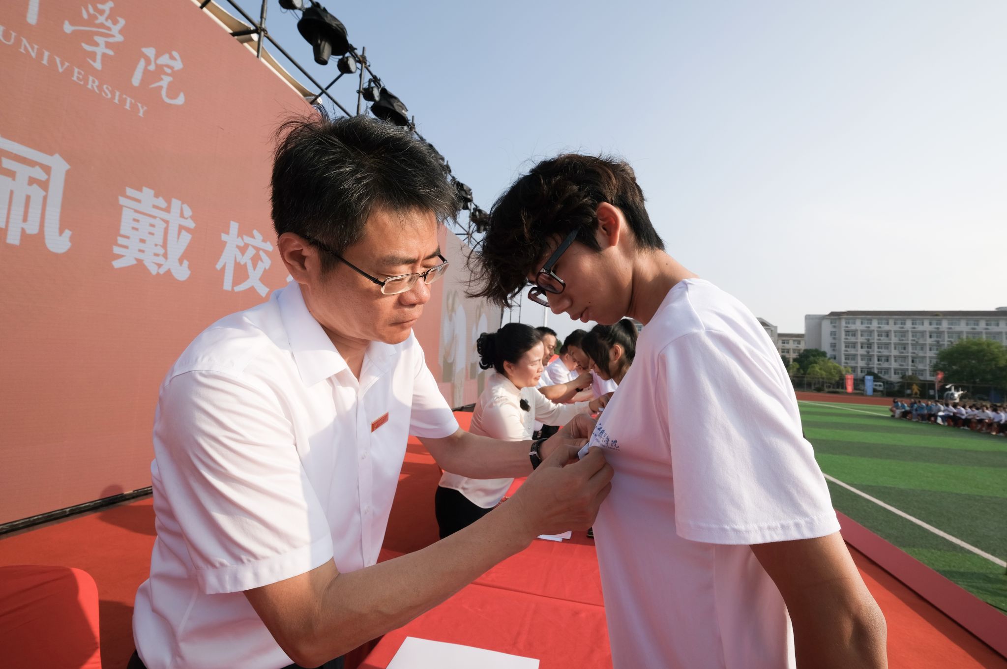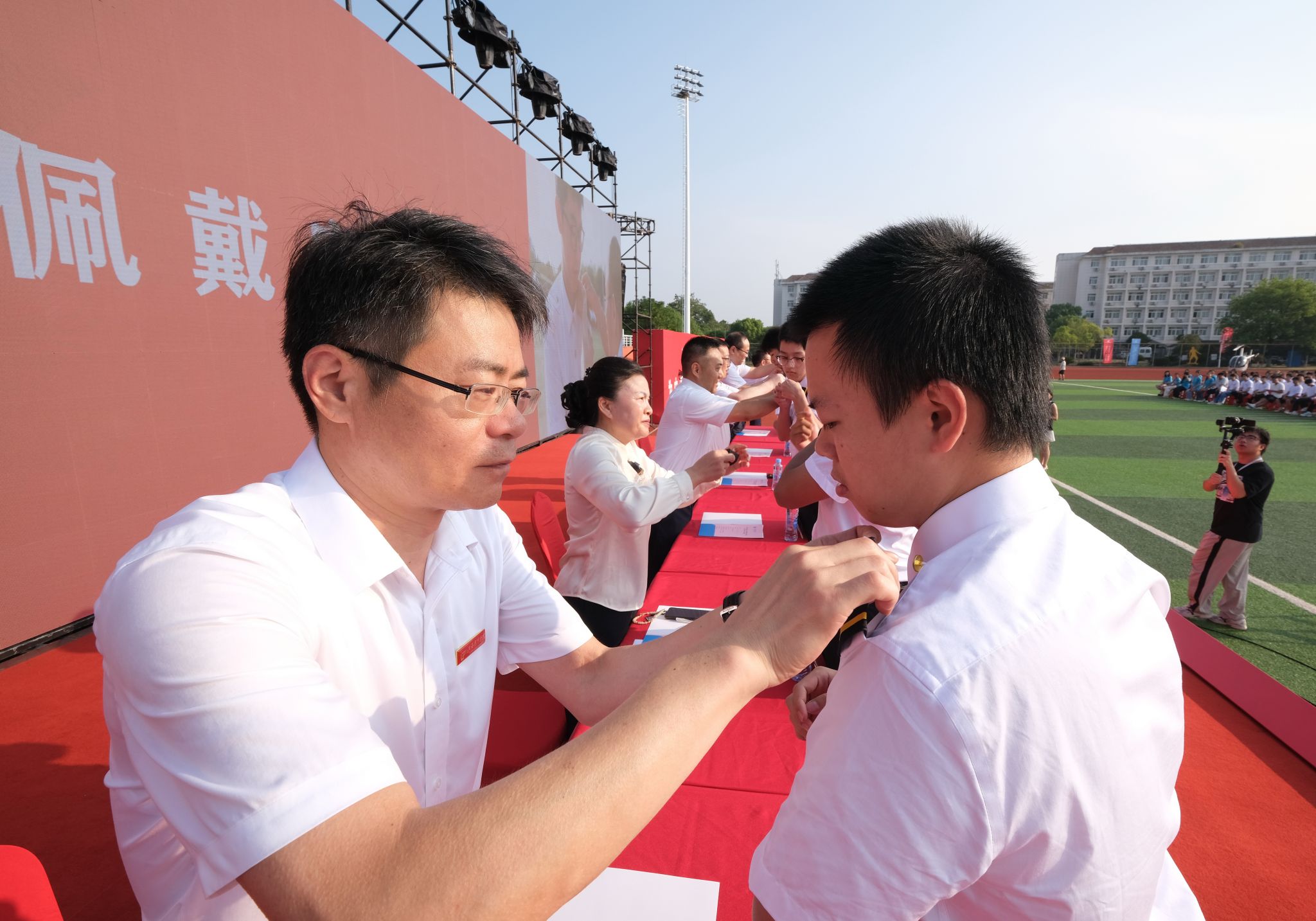 陈震、龙国英等在主席台就座的嘉宾为新生代表佩戴学校徽章,为首批飞行学员佩戴肩章。