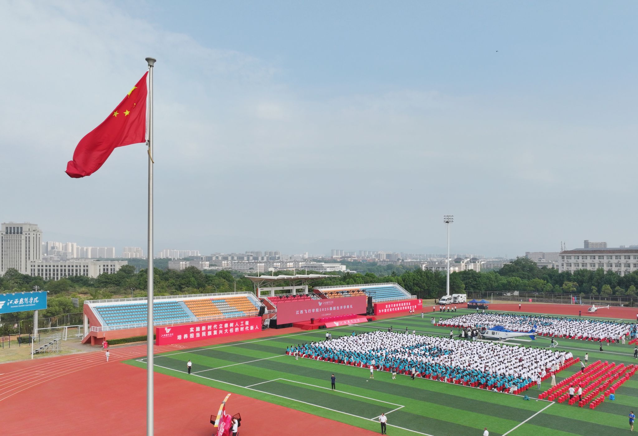 暖场表演中,学生以激情昂扬的歌声,表达对新生们最诚挚的欢迎。学校飞行教员驾驶新入列的两架直升机呼啸而来、高燃登场,现场气氛瞬间被点燃。在雄壮的国歌声中,五星红旗冉冉升起,全体师生肃立,开学典礼正式开始。