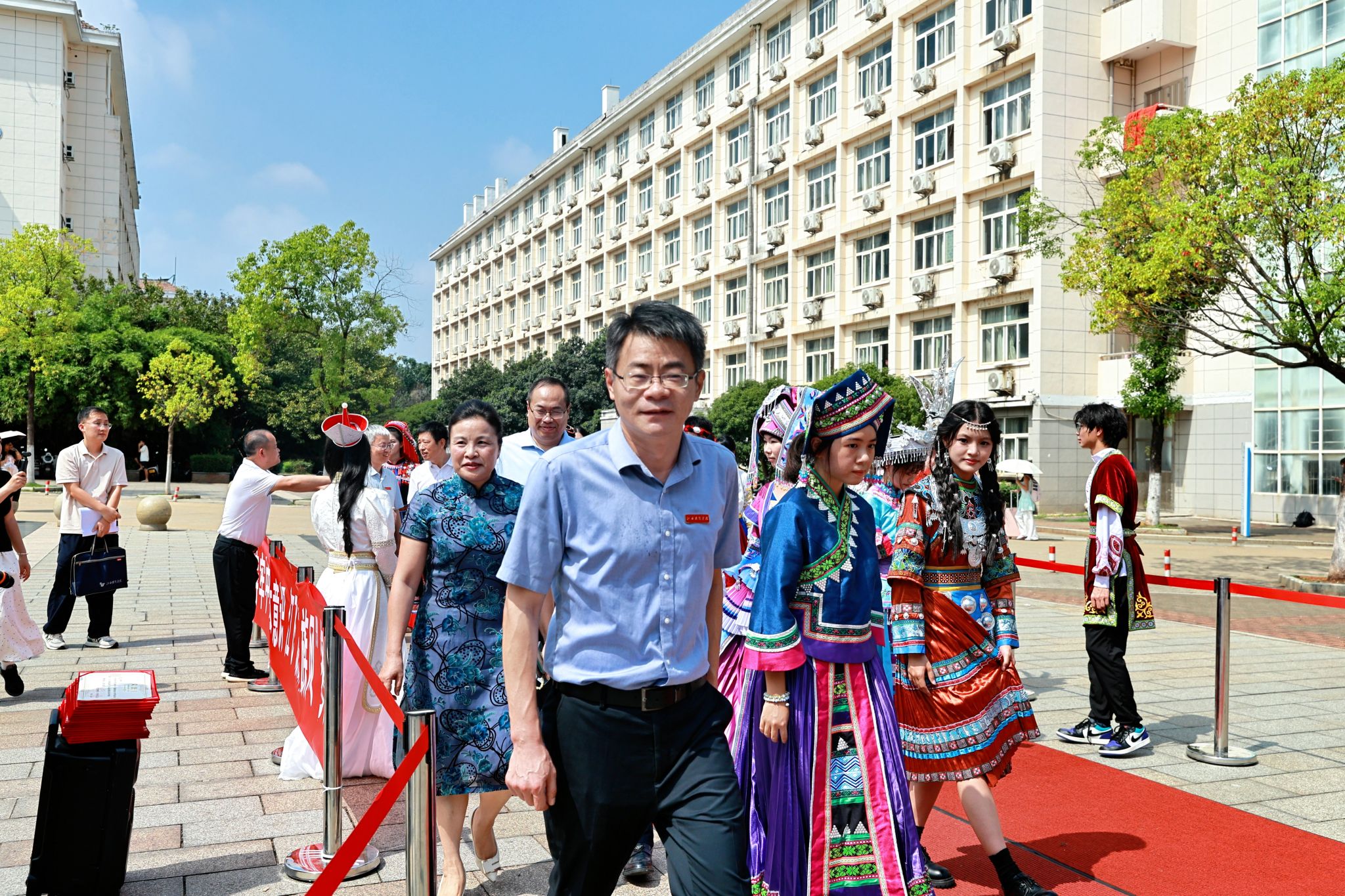 9月30日,学校“迎国庆·颂团结:铸牢中华民族共同体意识 江飞‘最炫民族风’多元绽放”主题民族走秀活动璀璨启幕。活动以灵动的民族艺术、厚重的文化底蕴为核心,将民族服饰与青春风采深度融合,生动诠释中华民族共同体意识。校党委书记陈震,校长龙国英,党委副书记张海涛,党委委员、副校长郭军华亲临现场观看表演。