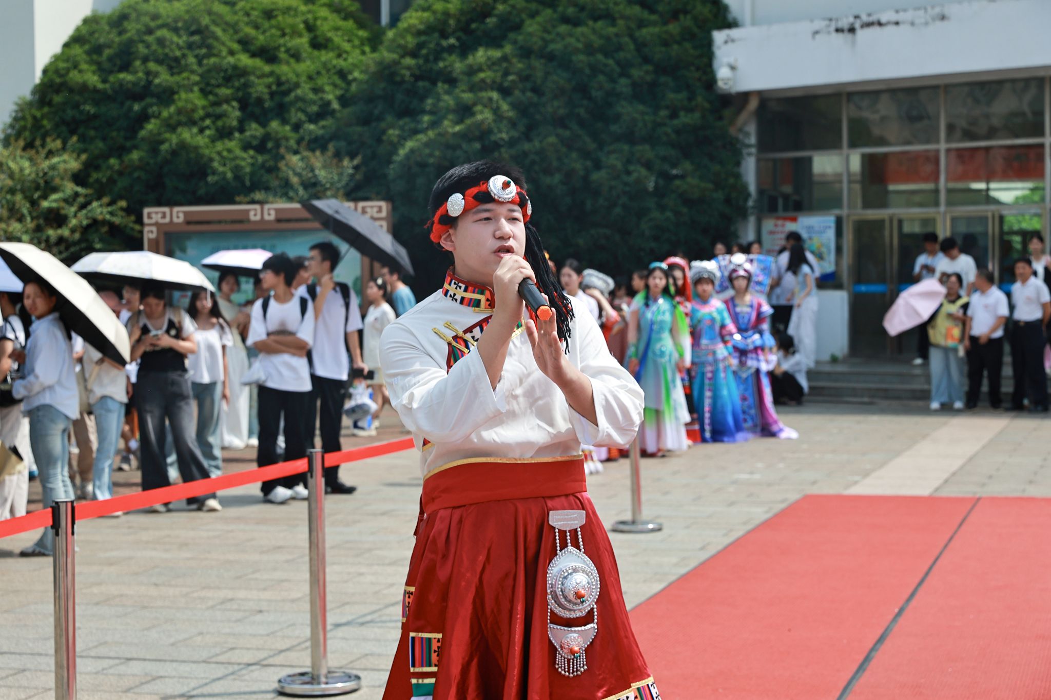 中场时段,周俊豪同学的歌曲表演嗓音清亮、情感充沛,为上下半场走秀搭建了完美的情绪桥梁。活动尾声,242工程造价专业张佳乐同学的民族歌曲旋律悠扬、唱腔醇厚,歌声中满含对民族文化的热爱与对民族团结的祝福。
