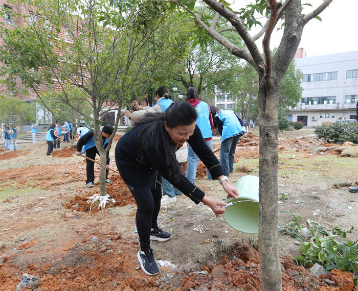 在植树现场,师生们分组进行植树,挥锄挖坑、培土围堰、浇水灌溉,每道工序都一丝不苟。一棵棵桂花树、杜鹃花球、红叶石楠枝叶繁茂,生机盎然。