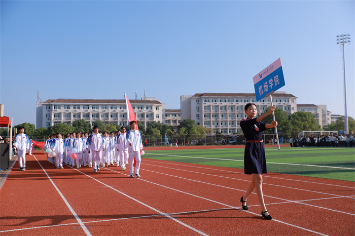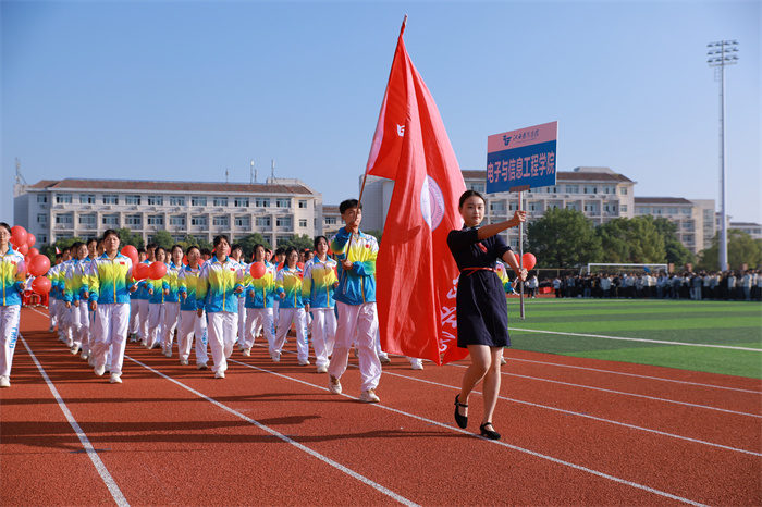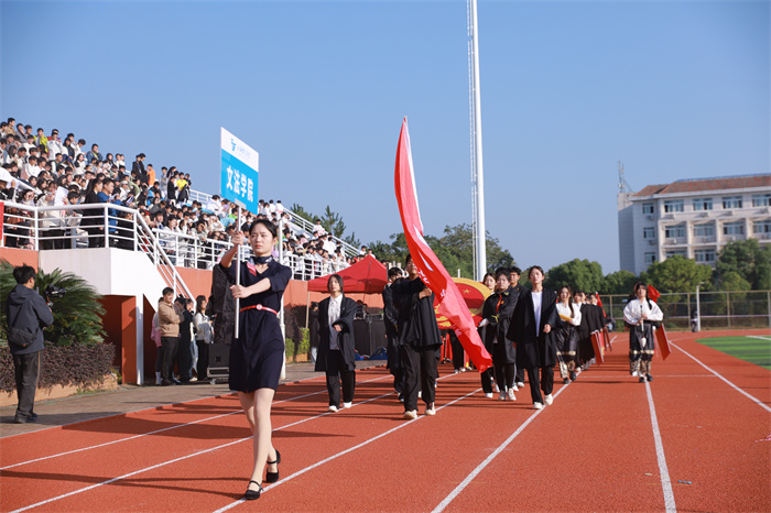 伴着嘹亮的乐曲,国旗方阵队昂首挺胸,迈着铿锵有力的步伐,庄严地步入体育场。校旗方阵、教职工方阵和各学院代表队紧随其后,师生们眼神炯炯、斗志昂扬,创意入场方式和特色鲜明的表演,赢得了在场师生们的阵阵掌声。