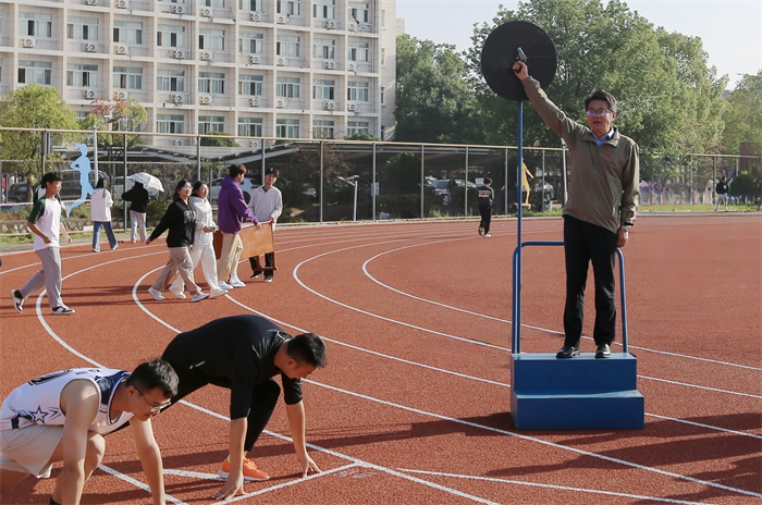 开幕式结束后,各项比赛继续如火如荼地进行。陈震为教职工男子100米径赛鸣枪发令。
