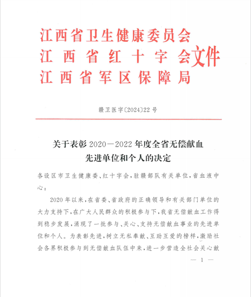 近日,省卫生健康委员会、省红十字会、省军区保障局印发《关于表彰2020-2022年度全省无偿献血先进单位和个人的决定》(赣卫医字〔2024〕22号),对积极参与无偿献血的先进单位和个人进行表彰,我校荣获全省无偿献血促进奖单位奖。