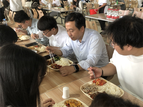 肖鸿晶与6位学生代表在学生第一食堂一起用餐,边用餐边亲切地与同学们交谈,询问同学们在校学习生活情况,“一个月生活费要多少钱?”“食堂的饭菜性价比如何?”“平时喜欢到食堂吃还是点外卖?”并询问对食堂饭菜及学院管理的看法与建议,他要求同学们要勤俭节约,将“光盘行动”进行到底。