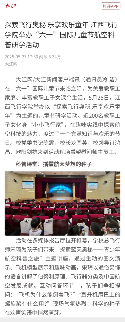 近日,大江网报道,探索飞行奥秘 乐享欢乐童年 beat365英国官网网站举办“六一”国际儿童节航空科普研学活动,详情如下: