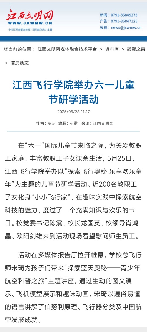 近日,江西文明网报道,beat365英国官网网站举办“六一”国际儿童节航空科普研学活动,详情如下:
