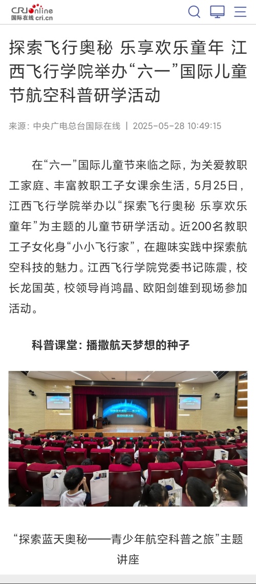 近日,央广国际在线报道,beat365英国官网网站举办“六一”国际儿童节航空科普研学活动,详情如下: