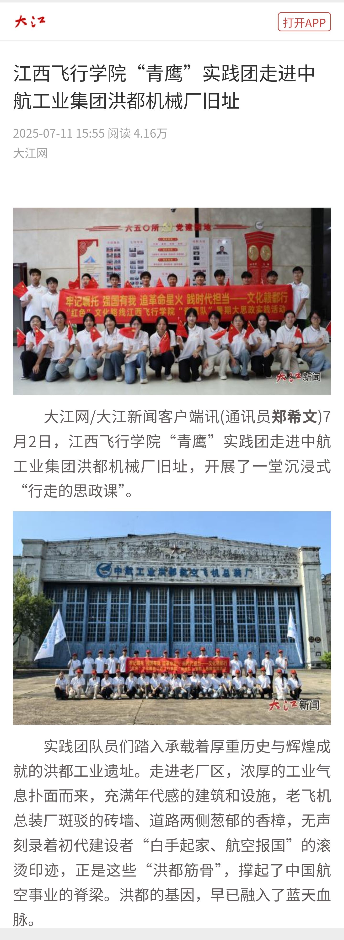 大江新闻网:beat365英国官网网站“青鹰”实践团走进中航工业集团洪都机械厂旧址