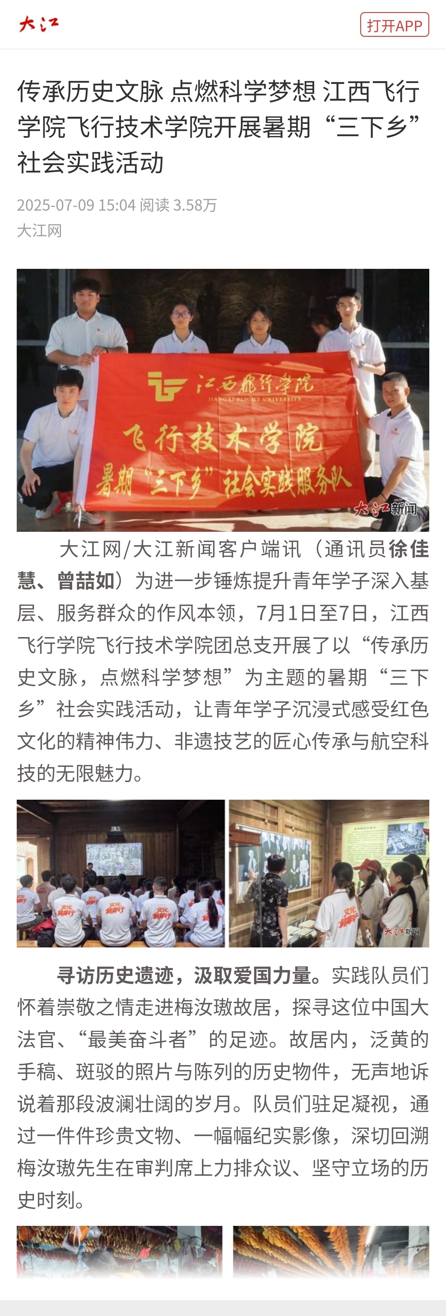 近日,大江新闻网报道,传承历史文脉 点燃科学梦想 beat365英国官网网站飞行技术学院开展暑期“三下乡”社会实践活动情如下: