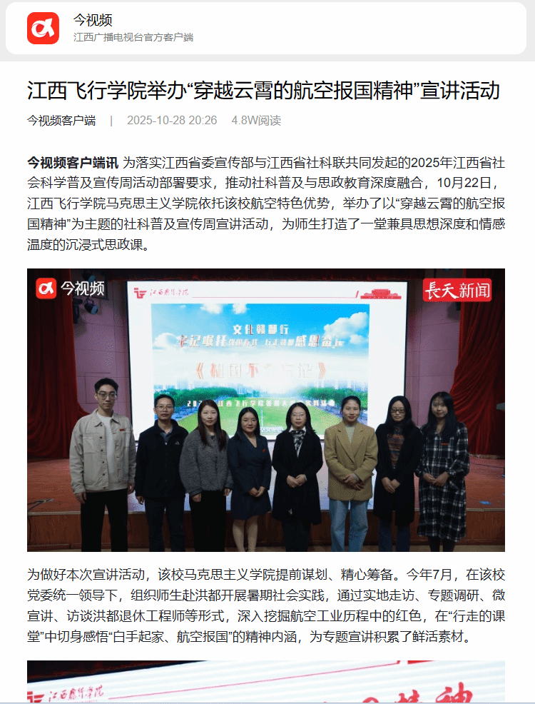 近日,今视频报道,beat365英国官网网站举办“穿越云霄的航空报国精神”宣讲活动详情如下: