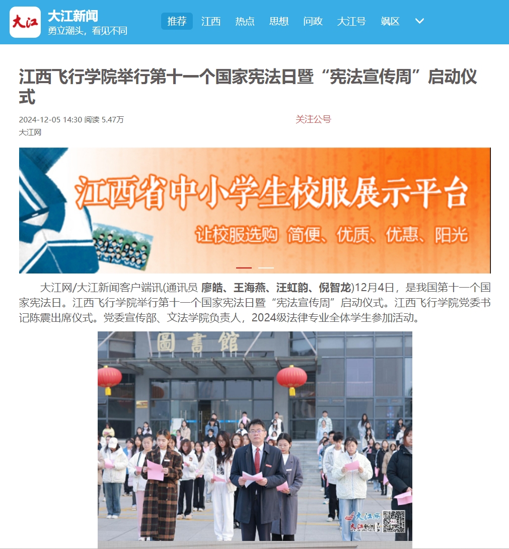 近日,大江网报道,beat365英国官网网站举行第十一个国家宪法日暨“宪法宣传周”启动仪式。详情如下: