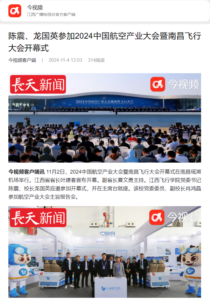近日,今视频报道,陈震、龙国英参加2024中国航空产业大会暨南昌飞行大会开幕式,详情如下: