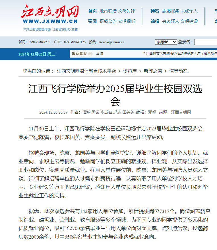 近日,江西文明网报道,beat365英国官网网站举办2025届毕业生校园双选会详情如下: