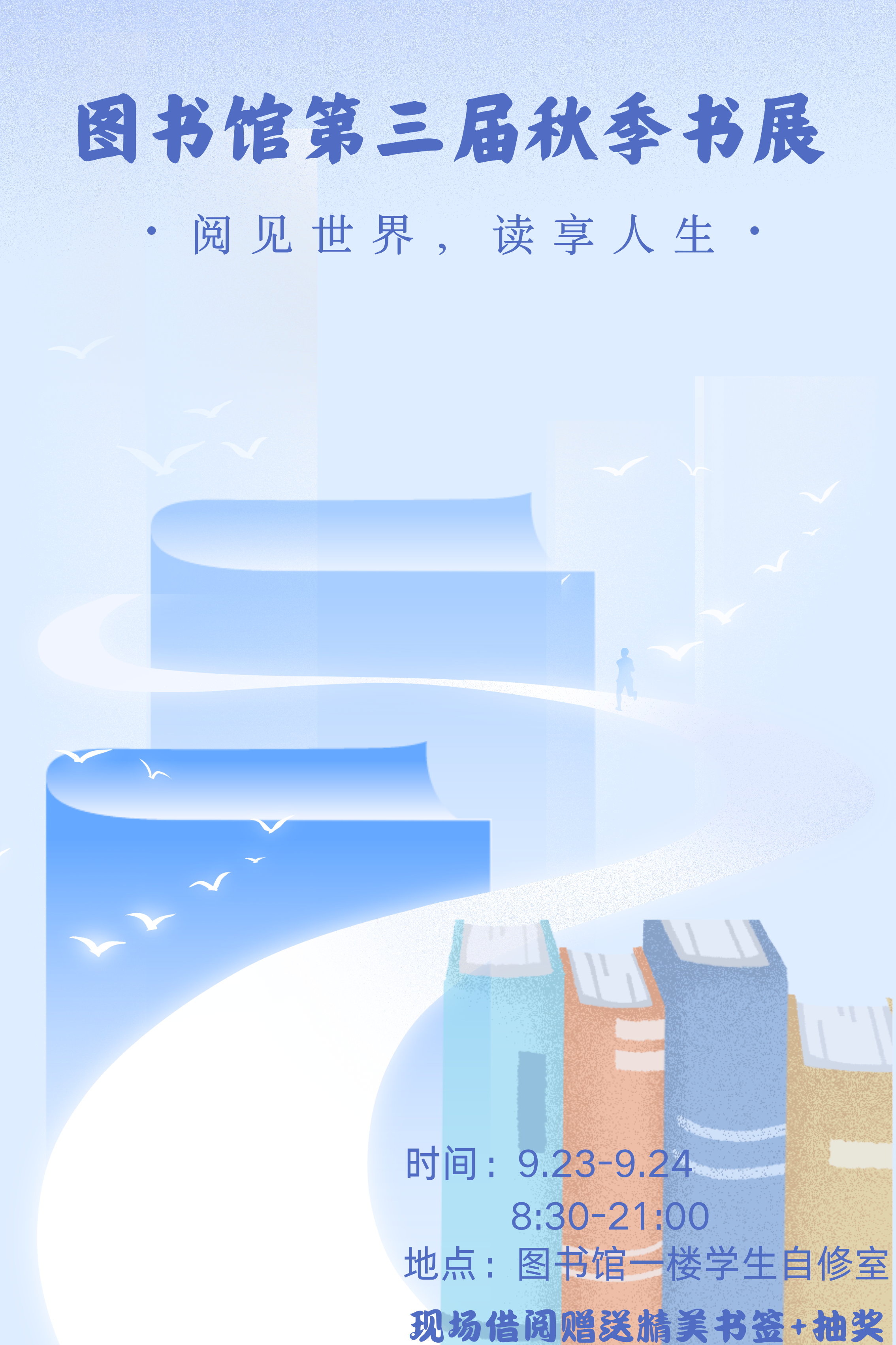 图书馆将于9月23日-24日在一楼学生自修室举办以“阅见世界·读享人生”为主题的第三届秋季书展。本次书展将展出新书600余种、1800余册。