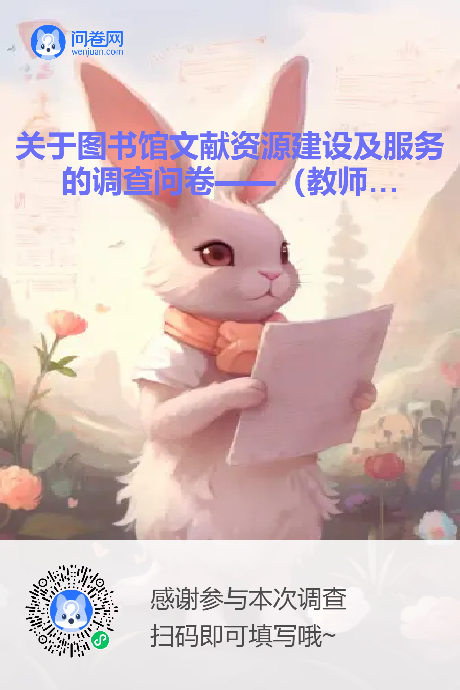 为更好地了解各位教师对图书馆文献资源建设和教学科研服务的需求和意见,图书馆现面向各二级学院开展问卷调查活动,希望各位教师积极配合、认真答卷、广泛转发,并有机会赢得图书馆送出的丰厚奖品。