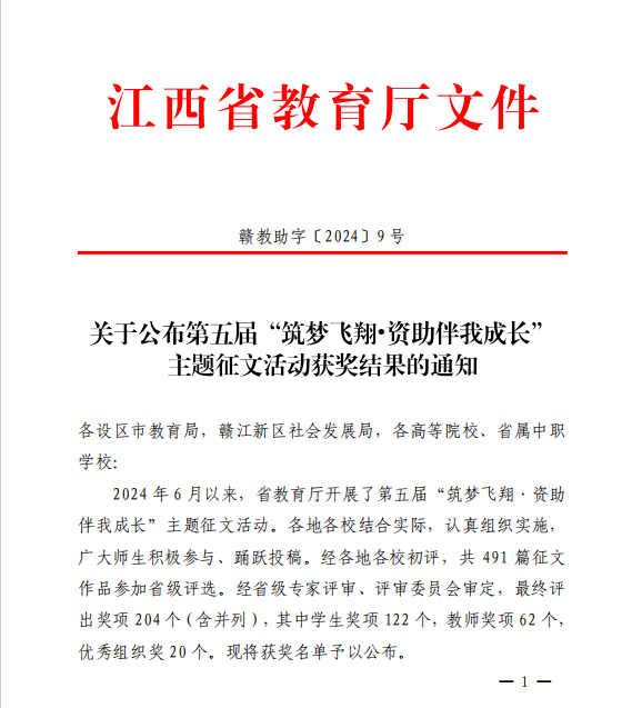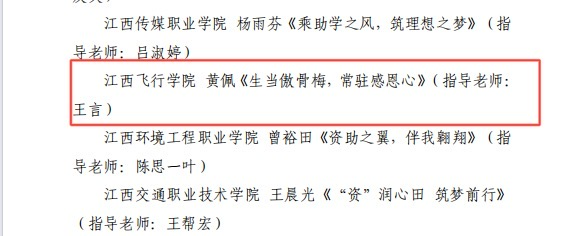 近日,省教育厅发布《关于公布第五届 "筑梦飞翔 资助伴我成长"主题征文活动获奖结果的通知》(赣教助字〔2024〕9号,航空运动学院黄佩《生当傲骨梅,常驻感恩心》(指导教师:王言)荣获三等奖。