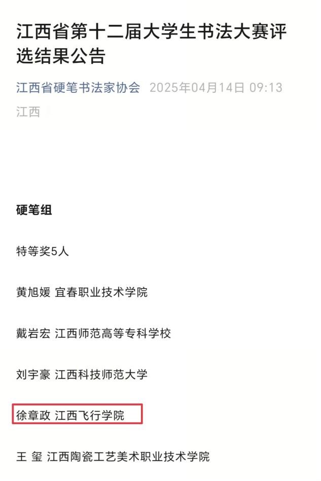 近日,江西省硬笔书法家协会公布了第十二届大学生书法大赛获奖结果。我校书法协会会员、航空机电工程学院2024级徐章政同学凭借硬笔书法作品《好了歌注》荣获特等奖。