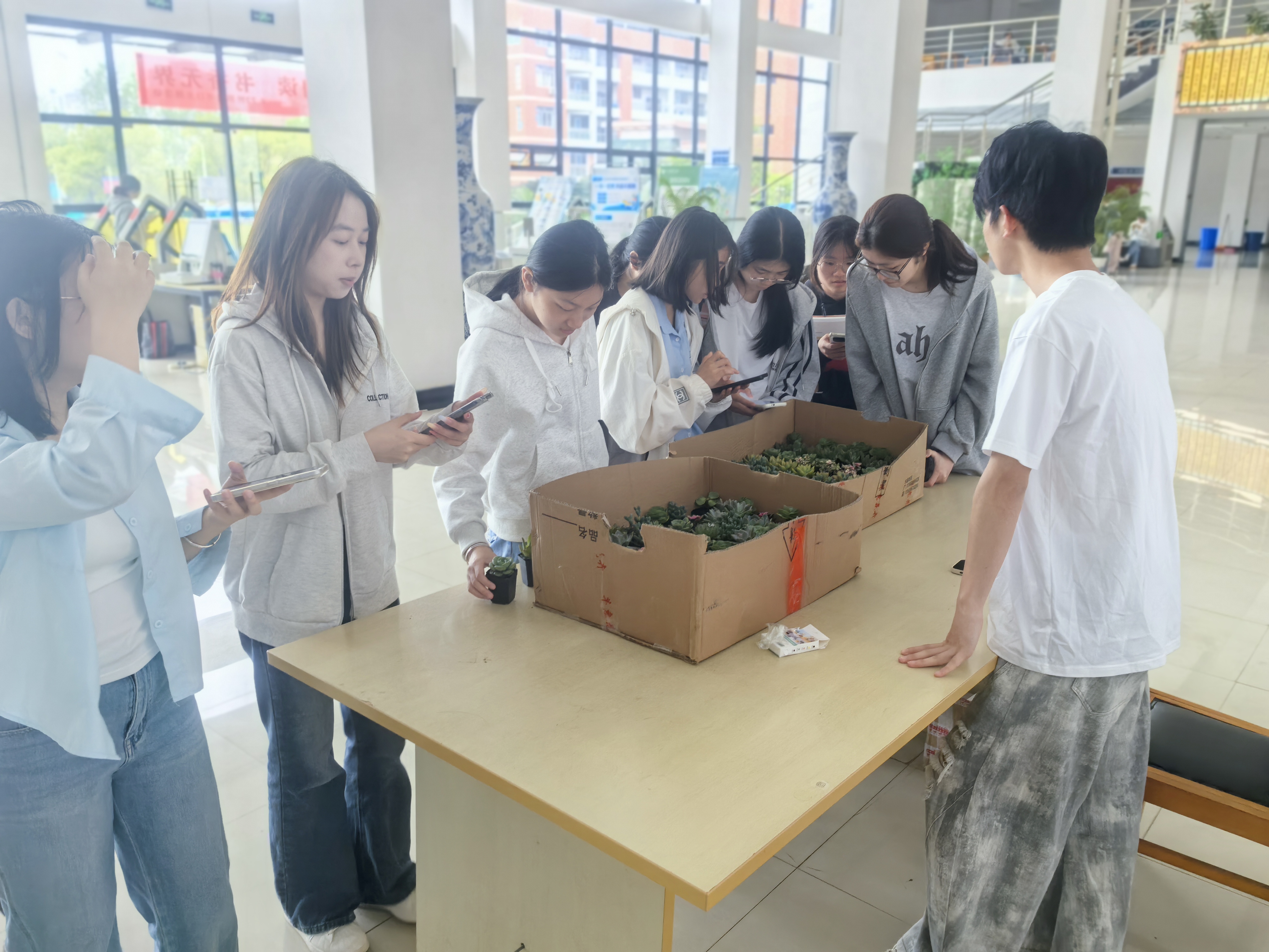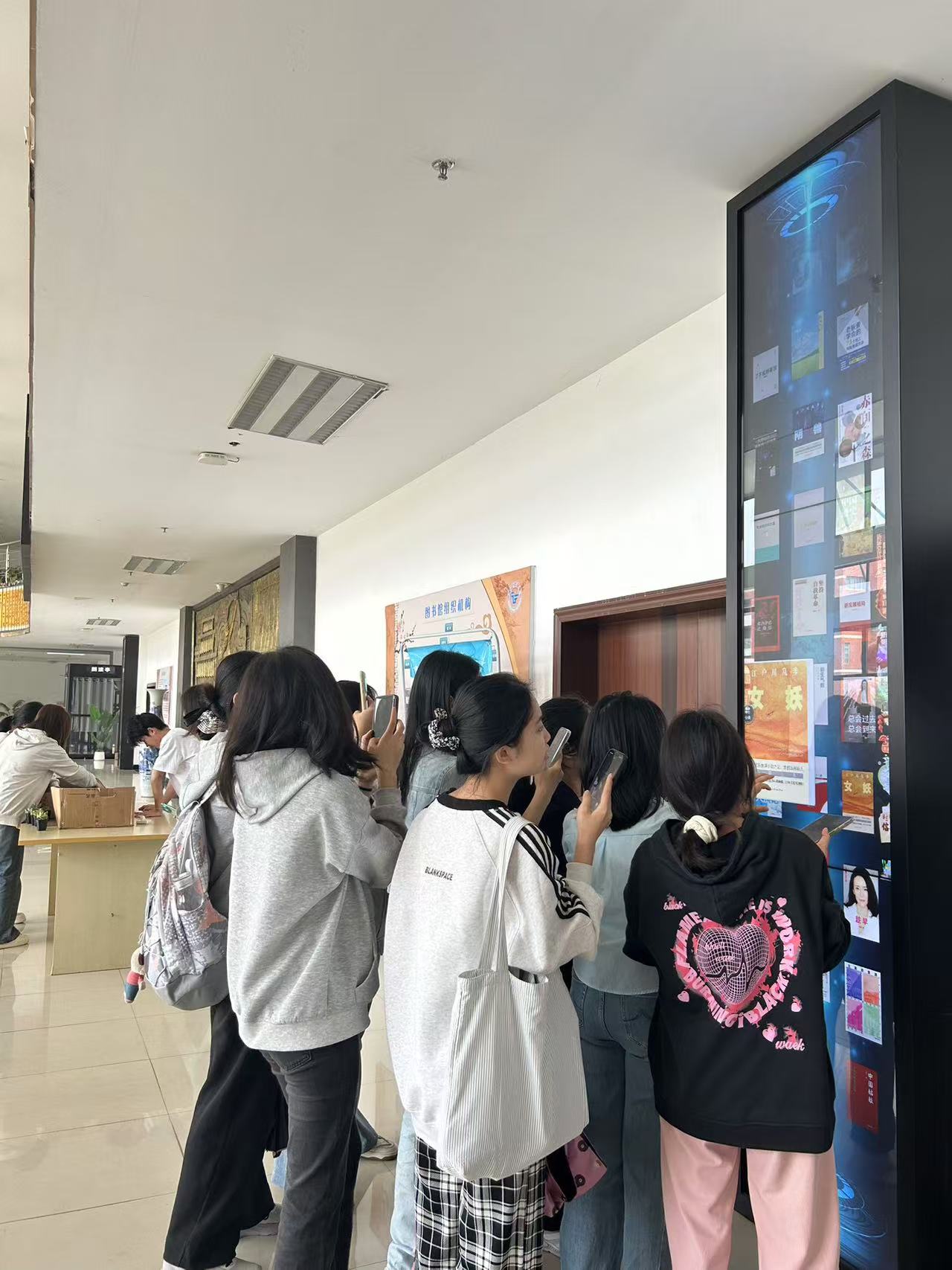 活动内容为邀请读者扫描馆内瀑布流中书籍的二维码,即可将电子书全文下载到手机上进行阅读,扫码10本书籍以上可领取精美绿植。活动吸引了众多师生参加。