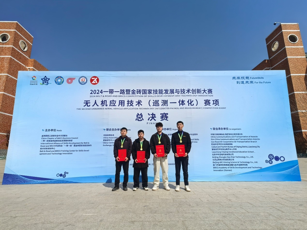 3月27日-30日,2024“一带一路”暨金砖国家技能发展与技术创新大赛无人机应用技术(巡测一体化)赛项全国总决赛在山东省聊城市举行。经过前期的初赛选拔,我校飞行技术学院派出由李文浩和徐幸超组成的教师组及2023级无人机应用技术2班熊鹰和文友义组成的学生组参加了总决赛。
