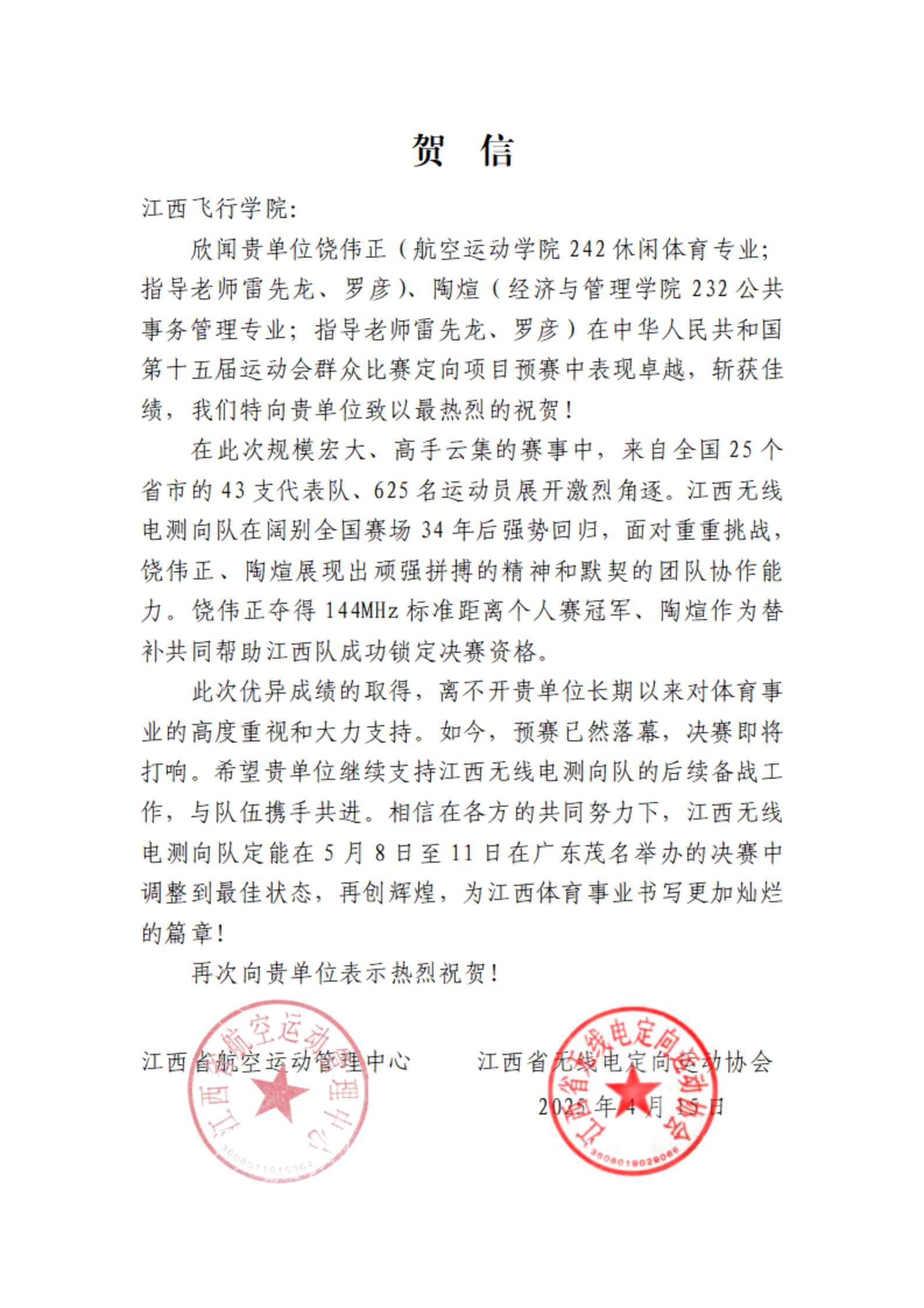 近日,我校收到江西省航空运动管理中心、江西省无线电定向运动协会发来的贺信。信中表扬我校饶伟正(航空运动学院242休闲体育本科)、陶煊(经济与管理学院232公共事务管理专科)等两名学生展现了顽强拼搏的精神和默契的团队协作能力,为江西无线电测向队在阔别全国赛场34年后强势回归、顺利锁定第十五届运动会群众比赛定向项目决赛资格做出了积极贡献。