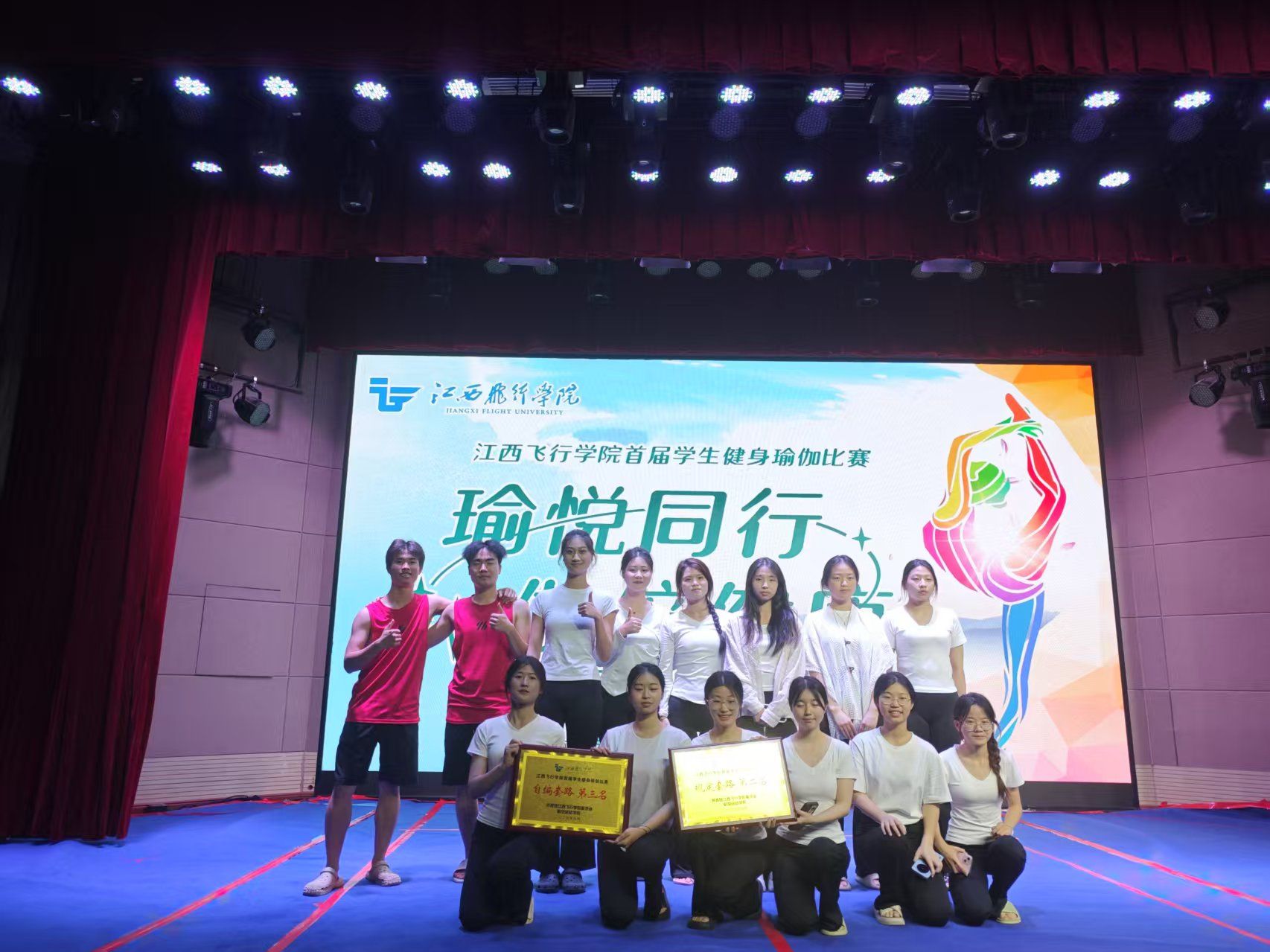 舞动青春旋律,诠释瑜伽之美。5月14日下午,在“瑜悦同行,伽倍健康”瑜伽比赛现场,赣物远航班的同学身姿优雅,配合默契,将瑜伽的力与美展现到极致。经过激烈的角逐,赣物远航班的参赛队员们荣获规定套路第二名。