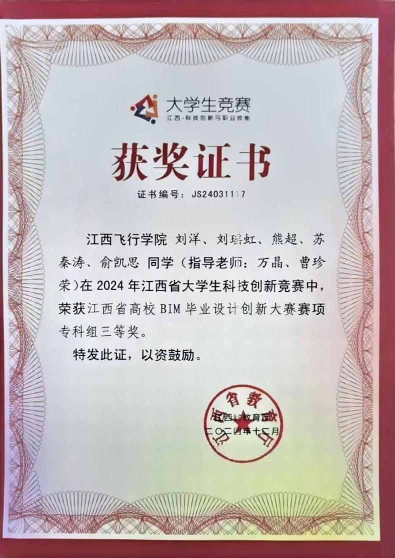 【喜报】机场学院学子在2024年江西省第四届高校BIM毕业设计创新大赛获三等奖