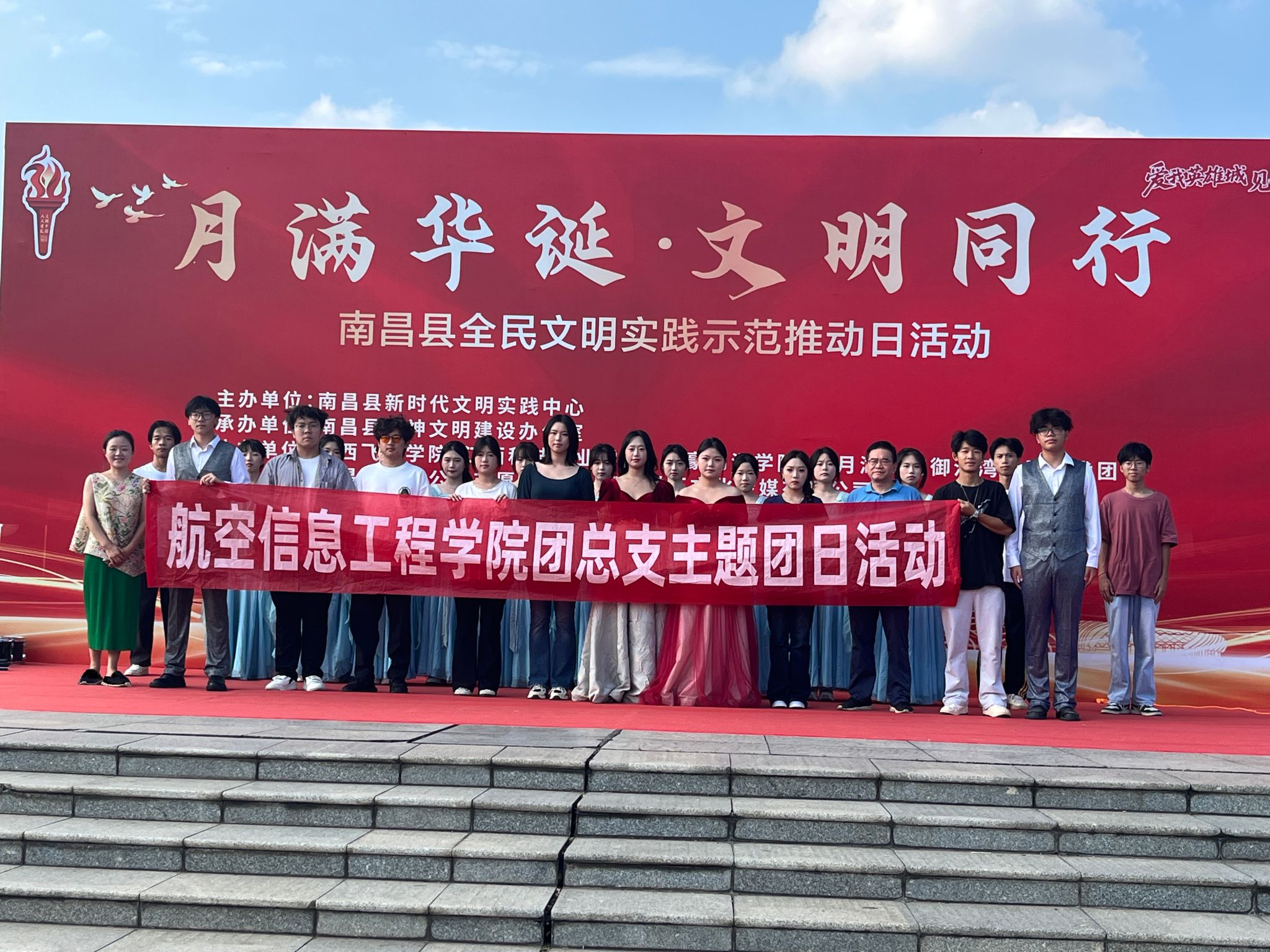 庆祝中华人民共和国成立76周年,弘扬爱国主义精神,凝聚青春奋进力量,9月27日下午,航空信息工程学院学生党支部联合南昌县新时代文明实践中心在南昌县澄碧湖南苑广场组织开展主题团日活动。航空信息工程学院党总支副书记李晓华、学生党支部书记康琳娜,学院入党积极分子、共青团员等共30余人参加此次活动。