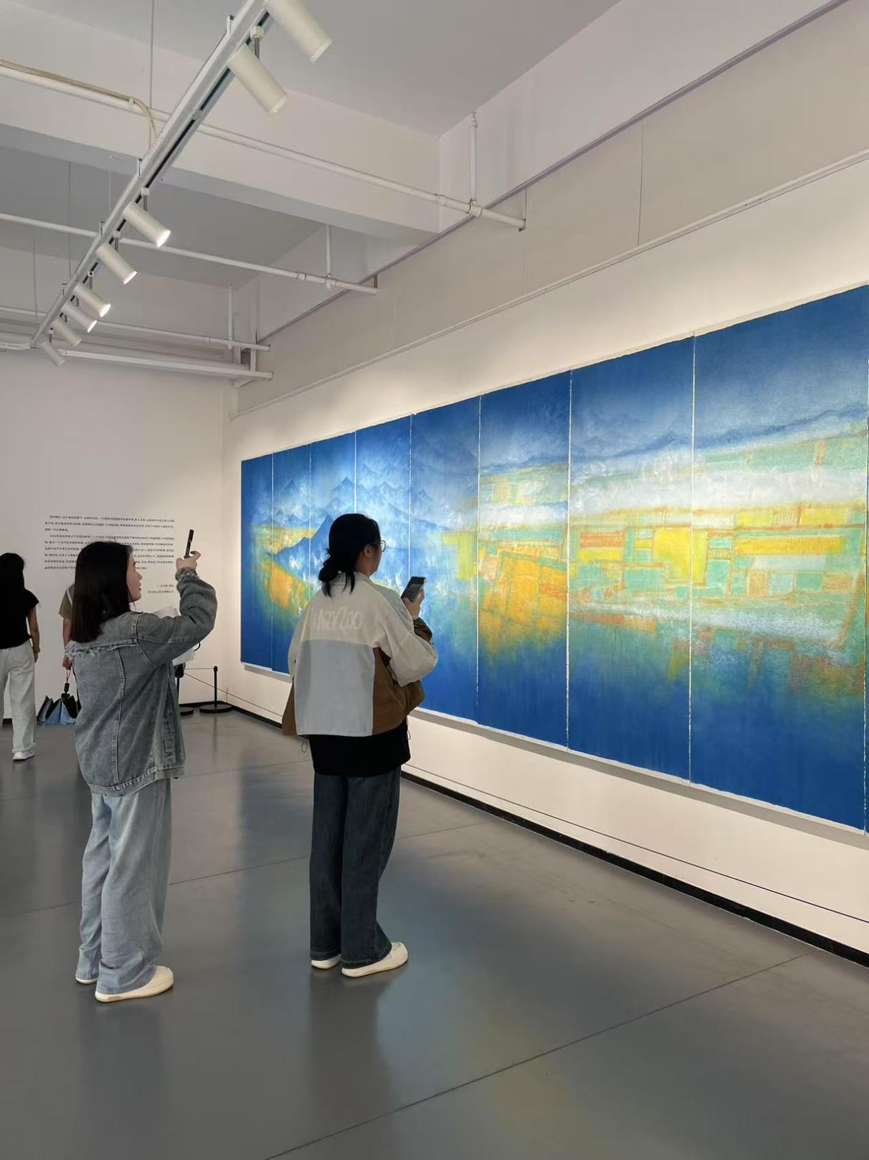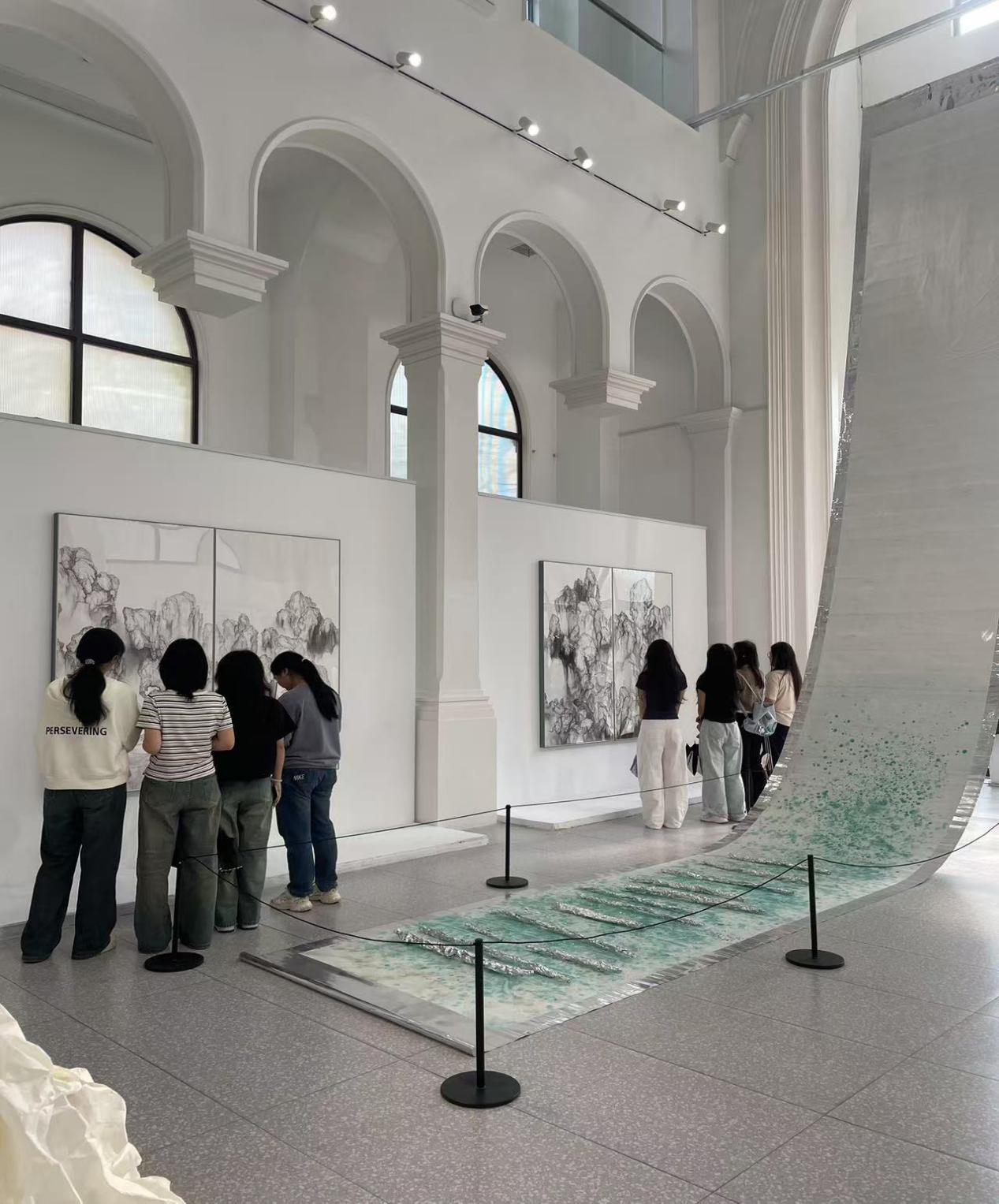 非遗刻纸活动结束后,学生们还参观了高新美术馆举办的“境生桃源——穿越自然的想象”艺术作品展,主题源自东晋诗人陶渊明笔下的《桃花源记》,作品从纸本水墨、绢本工笔、宣纸装置、水墨摄影、记录影像等不同媒介进行呈现,以当代水墨的语言展开了一场跨越时间与心灵的艺术旅程。徐建勋同学表示:“作品启发了我们去反思尘世喧嚣,追寻内心的宁静与生活的美好。”