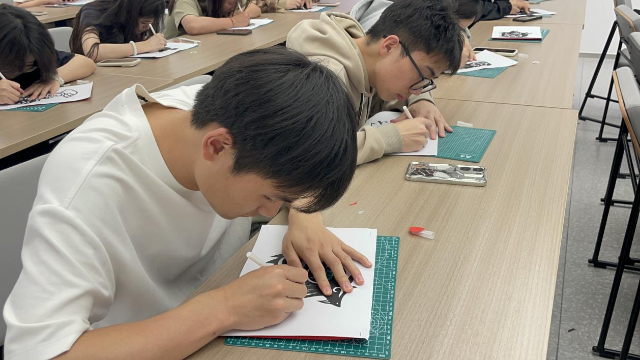 活动现场,学生们系统学习了刻纸艺术的发展历程,对这门古老艺术有了一个全面的认知。随后,老师借助大屏幕展示了大量刻纸作品。传统刻纸画中,花卉、鸟兽图案造型灵动、栩栩如生,“福”字图案形态多样、变化万千,展现了传统刻纸艺术的精湛技艺与美好寓意。创新性刻纸画则融入二次元形象和游戏人物,新颖的题材吸引了学生们的强烈关注,体现出刻纸艺术在新时代的创新发展。“这次非遗刻纸体验让我触摸到了传统文化的脉搏。”24级物流工程2班的余祖旋同学说道。