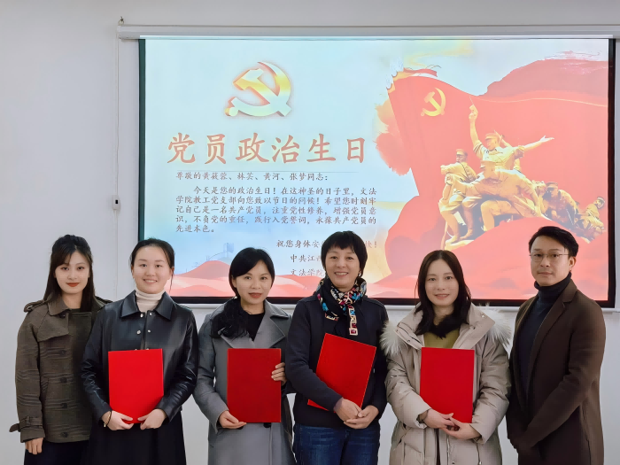 12月26日,文法学院教工党支部以“铭记政治生日,牢记党员责任”为主题开展系列微党课,为林芸、黄筱蓉、黄河、张梦同志过政治生日会。全体党员参加了活动。