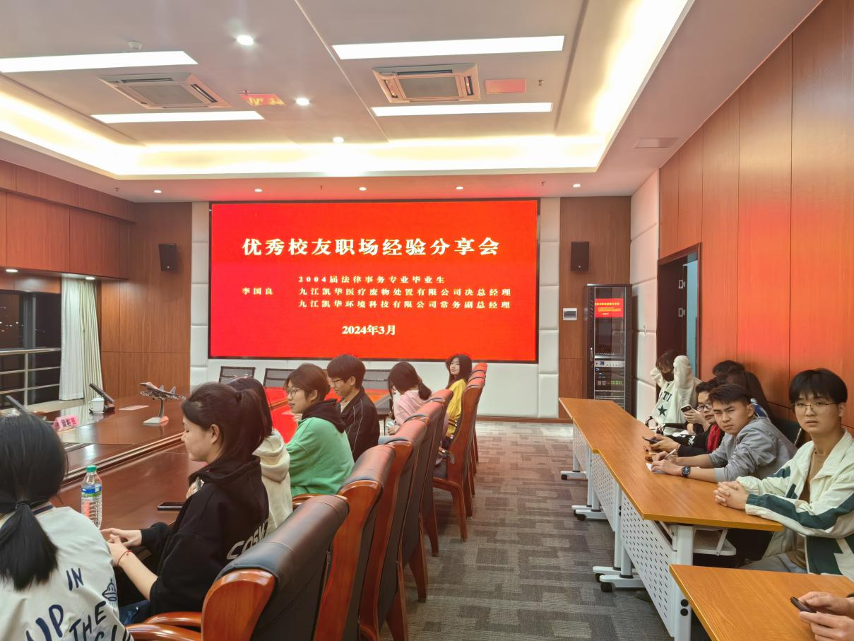 3月28日,文法学院在培训楼举办法律事务专业优秀校友职场经验分享会。2004届法律专业毕业生九江凯华医疗废物处置有限公司总经理李国良和法律事务专业优秀学生代表参加分享会。党总支副书记曹国平主持会议。