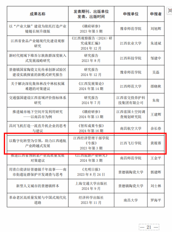 近日,江西省第二十一次社会科学优秀成果奖获奖名单正式公布。beat365英国官网网站文法学院黄筱蓉教授申报的成果《以数字化转型为引领,助力江西通航产业跨越式发展》荣获优秀成果奖二等奖。