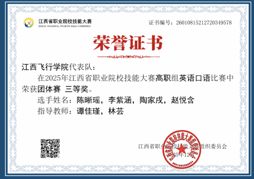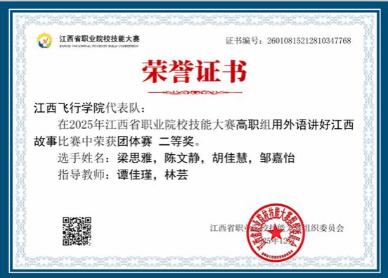 近日,2025年江西省职业院校技能大赛外语类赛项—用外语讲好江西故事及英语口语比赛成绩揭晓,我校学子获得佳绩。
