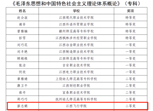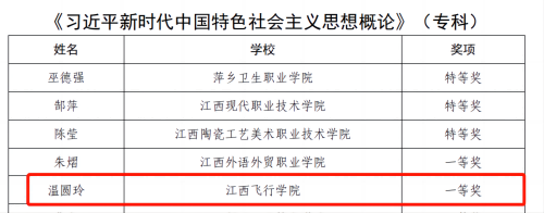 近日,江西省教育厅印发了《关于公布2024年度全省高校思政课和红色文化课程教学比赛结果的通知》,学校思政课教师温圆玲荣获《习近平新时代中国特色社会主义思想概论》课程专科组一等奖,廖志娟荣获《毛泽东思想和中国特色社会主义理论体系概论》课程专科组二等奖。